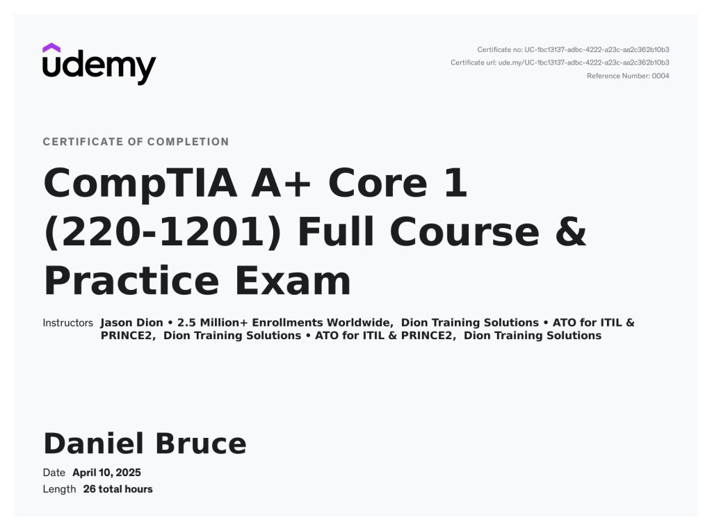 The core 1 A+ lectures were 26 hours and core 2 A+ was 37.5 hours of information. In my next blog post I will talk about the my next actions torwards a career in cyber security. I will cover my next two certifications, the next few modules that I have done in hack the box, labs I have been working on in hack the box, other cyber classes, and learnings I have been working on.